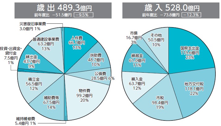 普通会計の総額は、歳入・歳出ともに令和5年度と比べて減少しました。主な要因は、新型コロナウイルス感染症への対応(△2.4億円)、東日本大震災関連事業(△43億円)の減によるものです。