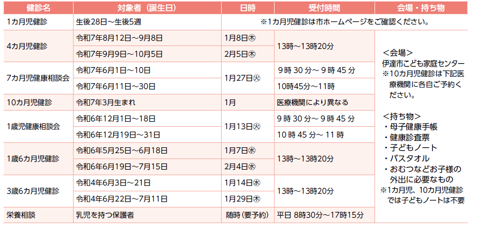 お子さんの健やかな育ちのため、成長・発達の節目の時期に健診、相談会を実施しています。詳しくはお問い合わせください。