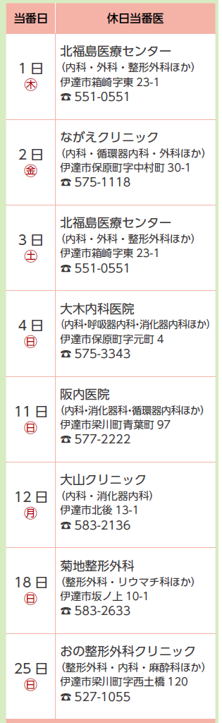 ※当番医が変更になる場合や、当番日に診療していない科もありますので、事前にお問い合わせの上受診してください。