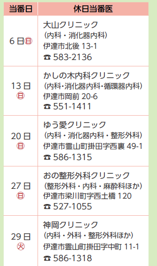 ※当番医が変更になる場合や、当番日に診療していない科もありますので、事前にお問い合わせの上受診してください。