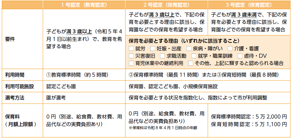 教育・保育給付認定の区分によって利用できる施設や申し込み時の添付書類、選考方法などが異なります。