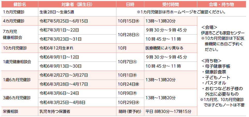 お子さんの健やかな育ちのため、成長・発達の節目の時期に健診、相談会を実施しています。詳しくはお問い合わせください。