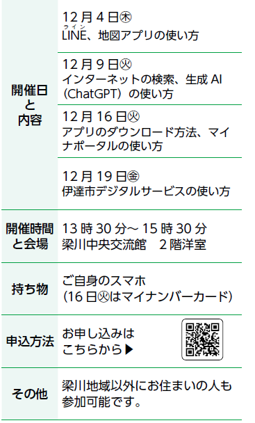 講座 スマホ教室 33/51 前の記事 次の記事 発行日 : 2025年10月23日 自治体名 : 福島県伊達市 広報紙名 : だて市政だより 2025年11月号 さまざまなスマホの使い方について学んでみませんか?興味のある内容を選択して受講できます。 定員:各回15人 参加費:無料 問合せ:デジタル変革課DX 推進係 【電話】575-1159 Tweet シェアする だてなび ー募集ー デジタル活用サポーター育成講座