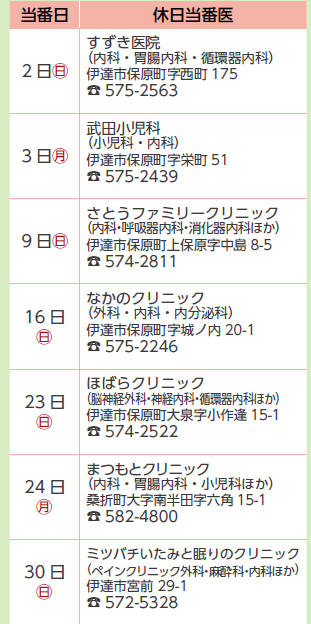 ※当番医が変更になる場合や、当番日に診療していない科もありますので、事前にお問い合わせの上受診してください。