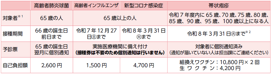 ※1…上記対象者のほか、60~64歳で心臓・腎臓・呼吸器またはヒト免疫不全ウイルスによる免疫の障がいがあり、身体障がい者手帳1級に相当する人も対象となります(帯状疱疹はヒト免疫不全ウイルスによる免疫の障がいのみ該当)。