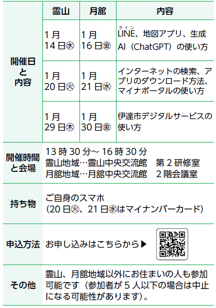 講座 スマホ教室(霊山・月舘地域) 26/42 前の記事 次の記事 発行日 : 2025年11月27日 自治体名 : 福島県伊達市 広報紙名 : だて市政だより 2025年12月号 さまざまなスマホの使い方について学んでみませんか?興味のある内容を選択して受講できます。 定員:各回15人 参加費:無料 問合せ:デジタル変革課DX推進係 【電話】575-1159 Tweet シェアする デジタル活用サポーター育成講座 だてなび ーイベントー