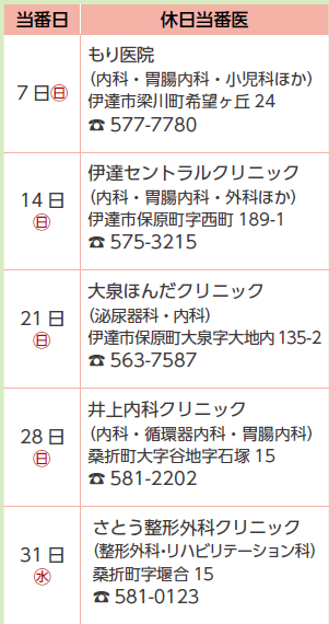 ※ 当番医が変更になる場合や、当番日に診療していない科もありますので、事前にお問い合わせの上受診してください。