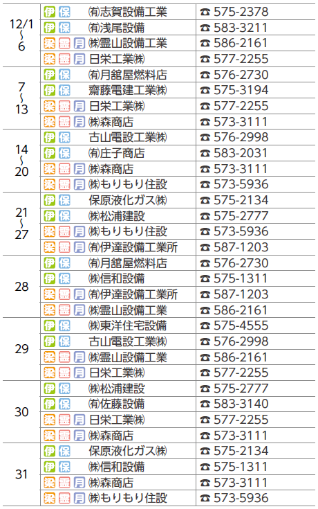 ■12月の水道修理当番表