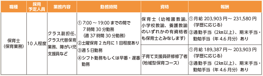 ※勤務時間については、ご相談に応じますが、短時間勤務を希望の場合も、シフト勤務もしくは早番・遅番勤務になります。ご相談は下記問い合わせ先までご連絡ください。