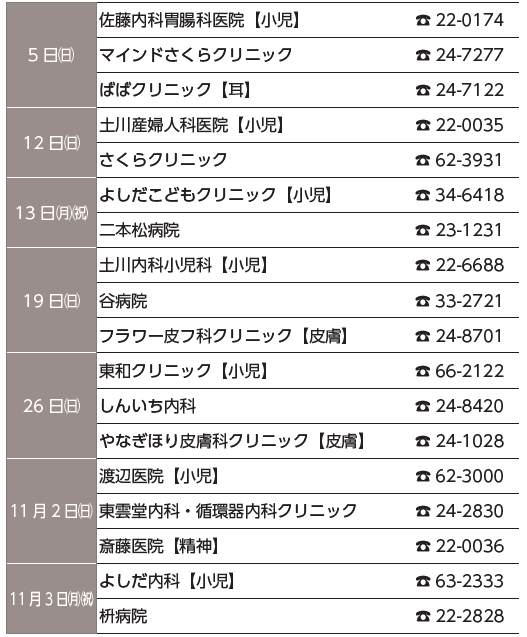 くらし 日曜・休日当番医 41/49 前の記事 次の記事 発行日 : 2025年10月01日 自治体名 : 福島県本宮市 広報紙名 : 広報もとみや 令和7年10月号 診察時間:9:00~11:30、14:00~16:30 ※定期的な診察や予防接種など緊急性のない受診はご遠慮ください。 上記以外のスケジュールは安達医師会HPをご確認ください。 Tweet シェアする 市民のうごき(9月1日の現住人口) 休日・夜間の救急医療機関