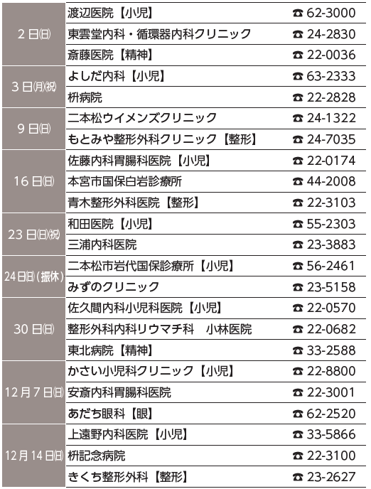 くらし 日曜・休日当番医 33/41 前の記事 次の記事 発行日 : 2025年11月01日 自治体名 : 福島県本宮市 広報紙名 : 広報もとみや 令和7年11月号 診察時間:9:00~11:30、14:00~16:30 ※定期的な診察や予防接種など緊急性のない受診はご遠慮ください。 上記以外のスケジュールは安達医師会HPをご確認ください。 Tweet シェアする 市民のうごき(10月1日の現住人口) 休日・夜間の救急医療機関