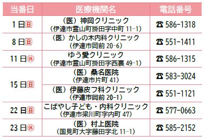 ※当番医が変更になる場合や診療していない科もありますので、事前に電話で確認のうえ、受診してください。