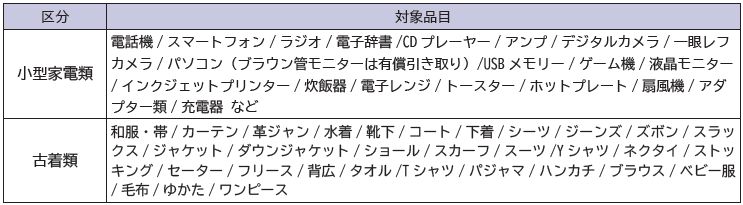 町では、回収ボックスに入らない小型家電と通常燃やせるごみとして処分する古着類の回収を実施します。ご自宅に眠っている小型家電や古着類がありましたら、ぜひこの機会にご利用いただき、ごみ減量化と再資源化にご協力ください。