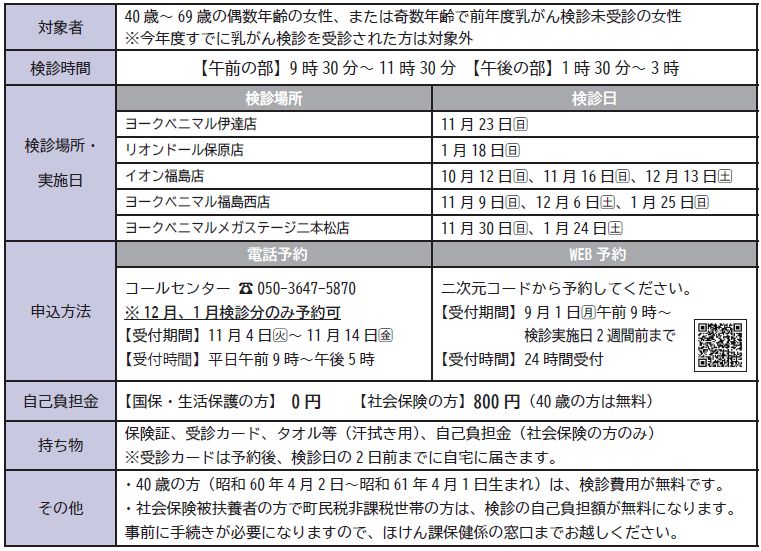 福島県では、国見町を含む県北地区6市町と連携し、商業施設で乳がん検診のバス検診を実施しています。町の総合検診や施設検診での受診が難しい方は、ぜひご利用ください。