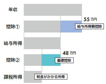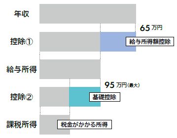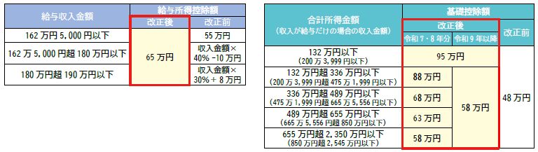 令和7年度税制改正により、控除額が見直され、給与所得控除が65万円(+10万円)に、基礎控除が最大95万円(+47万円)に引き上げられました。