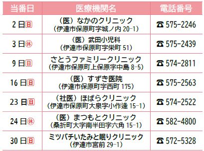 ※当番医が変更になる場合や診療していない科もありますので、事前に電話で確認のうえ、受診してください。