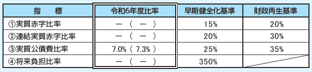 本村は、令和6年度決算でも、「健全化判断比率」の4つの指標とも基準をクリアしました。