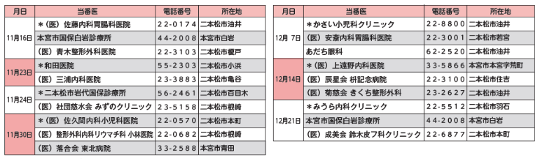 (2)当番医が変更になる場合もあります。最新の情報は一般社団法人安達医師会ホームページでご確認ください。(【HP】http://www.adachi-med.or.jp)