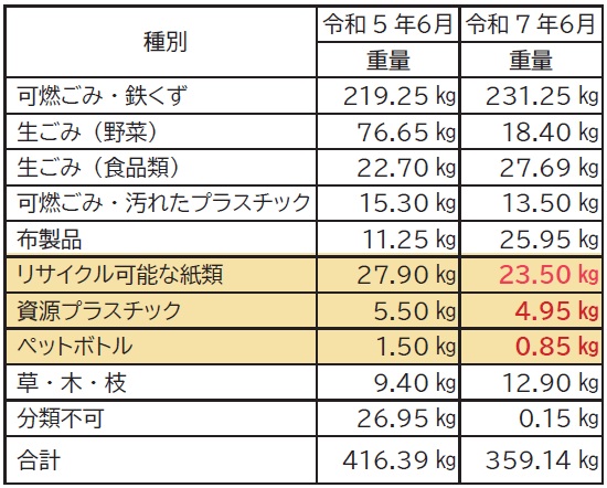 令和5年の調査結果と比較すると、リサイクル可能な紙類、プラスチック、ペットボトルの混入量が減少しており、リサイクル率が向上していると考えられます。