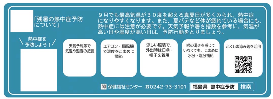 健康 残暑の熱中症予防について 11/21 前の記事 次の記事 発行日 : 2025年09月12日 自治体名 : 福島県磐梯町 広報紙名 : 磐梯弘報 2025年9月号 Tweet シェアする 令和8年度コミュニティ助成事業のお知らせ 磐梯町地域おこし協力隊通信 9月号