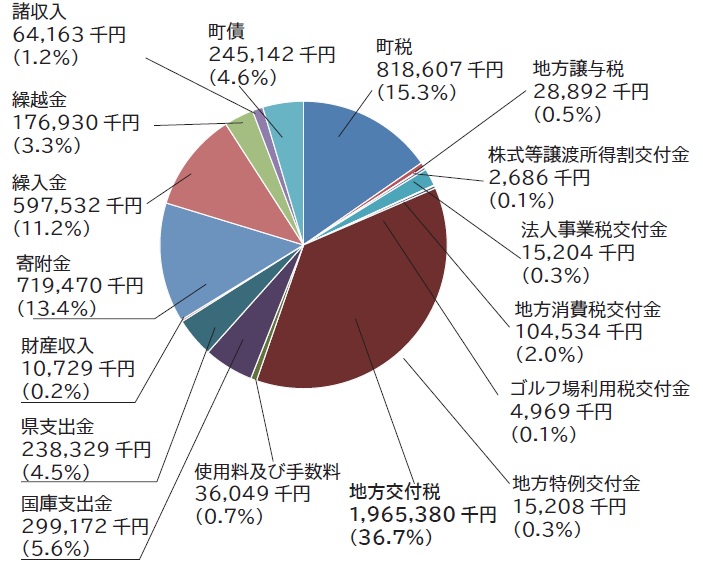 歳入においては、地方交付税が36.7%を占める19億6,538万円(+2.3%)、町税が15.3%、8億1,860万7千円(+12.9%)、寄付金が13.4%、7億1,947万円(+13.9%)と、それぞれ増額となっております。