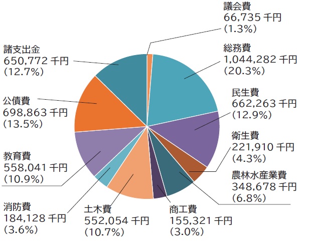 歳出においては、教育費が町民体育館維持補修工事や認定こども園開園準備事業の実施等で9,934万円(+21.7%)、農林水産業費が就農支援補助金の増や農業施設長寿命化改修工事の実施等により5,347万円(+18.1%)、総務費がふるさと納税推進業務委託料の増や会計年度任用職員の処遇改善等により1億1,031万円(+11.8%)と、それぞれ増額となっています。