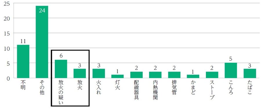 会津若松地方広域圏内における令和6年中に発生した火災の出火原因が、「その他」「不明」を除いた中で多い順に「放火の疑い」が6件、「こんろ」、「放火」が3件、「火入れ」「たばこ」などを除く出火原因の約3割を占めているのが放火関連によるものです。