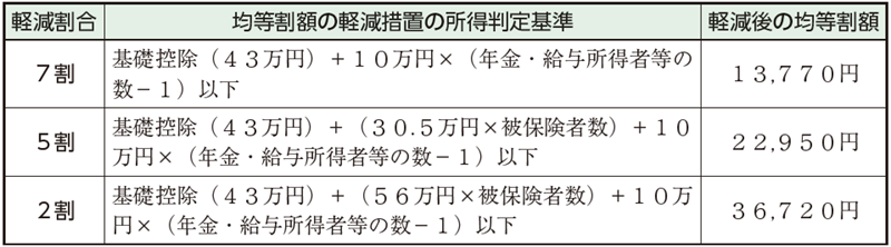 同一世帯内の被保険者及び世帯主の総所得金額等の合計額が基準額以下の場合、下記のとおり均等割額は軽減されます。