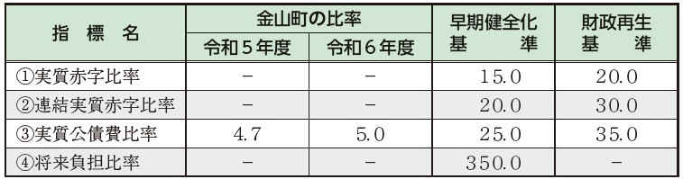 健全化判断比率…町の財政状況を客観的に表し、財政の早期健全化や再生の必要性を判断するための指標