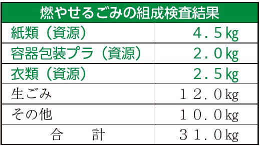 町で収集した燃やせるごみは、会津若松市の環境センターで焼却処理されます。環境センターでは定期的に、燃やせるごみの組成分析検査を実施しており、9月には金山町の燃やせるごみを対象に検査が行われました。無作為に選ばれた燃やせるごみ約31kgの検査結果をお知らせします。