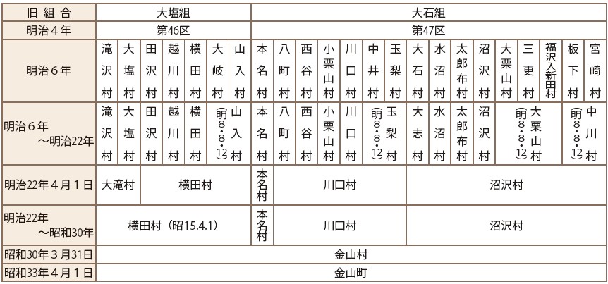 ・1955年(昭和30年)3月 『沼沢・川口・本名・横田の4ヶ村が合併し金山村となる』