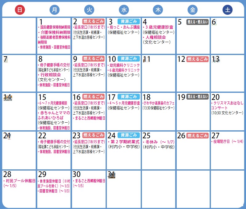 くらし 12月の行事カレンダー 24/26 前の記事 次の記事 発行日 : 2025年12月01日 自治体名 : 福島県西郷村 広報紙名 : 広報にしごう 令和7年12月号 今月の顔:6~7ヶ月児健康診査(10/20) (※カレンダー中の写真は本紙をご覧ください。) ※乳幼児健康診査・健康相談については、対象となる方に通知をお送りしますので、そちらをご覧ください。 Tweet シェアする 健康がもっと楽しくなる健康コラム 第45回 12月の休日当番医