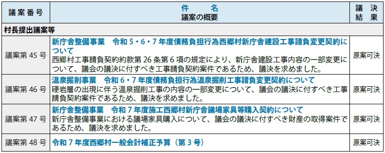 令和7年第2回臨時会が8月6日(水)に行われました。村長提出議案4件が原案可決されました。議案名、議決結果については、次のとおりです。
