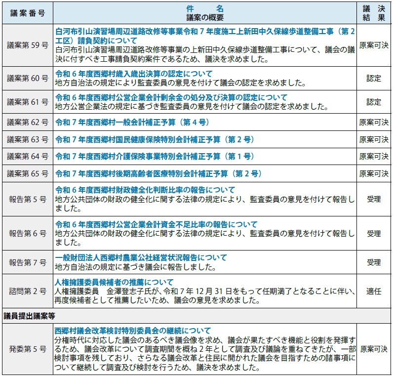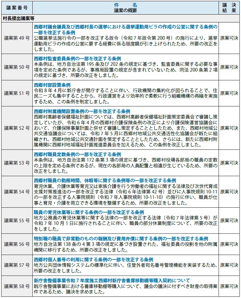令和7年第3回定例会が9月4日から11日までの8日間の会期で行われました。条例の制定および改正、補正予算等、村長提出議案15件が原案可決、決算2件が認定、諮問1件が適任、報告3件が受理されました。また、議員提出案件1件が原案可決されました。議案名、議決結果については、次のとおりです。