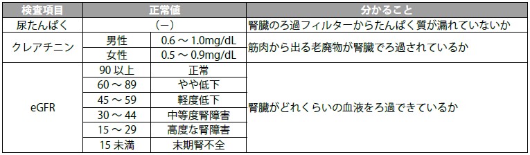 特定健診等の結果から、腎臓のはたらきが正常かどうか確認できます。下記の項目・数値を参考に、ご自分の結果と照らし合わせてみましょう。