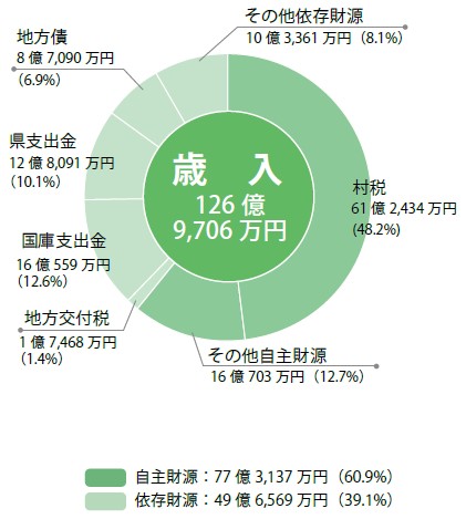 自主財源:村税や使用料等村が自主的に収入できるお金です。