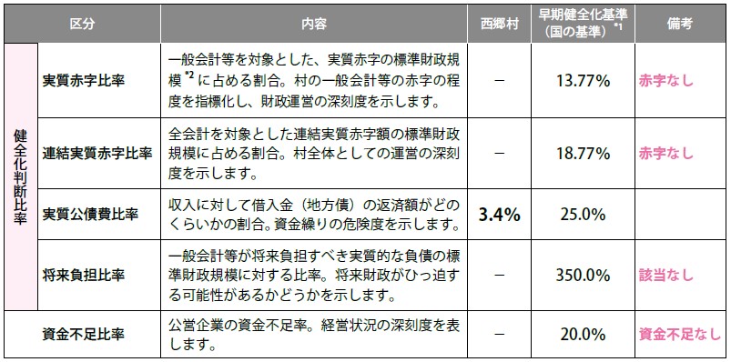 財政指標とは、全国で統一されている指標で、自治体の財政の健康診断に用いられます。健全化判断比率(財政の健全化を表す4つの指標)および資金不足比率は、いずれも基準を超えておらず、村の財政指標は良好な水準です。