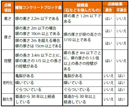 ブロック塀等の点検表:下記項目のうち、点検結果が1つでも不適合であればブロック塀等の安全対策が必要です。