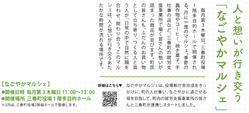 くらし 【特集】お買い物から始まる、就労支援事業所とのつながり(1) 1/36 次の記事 発行日 : 2026年02月01日 自治体名 : 福島県三春町 広報紙名 : 広報みはる 令和8年2月号 ※詳細は、本紙P.2~3をご覧ください。 Tweet シェアする 【特集】お買い物から始まる、就労支援事業所とのつながり(2)