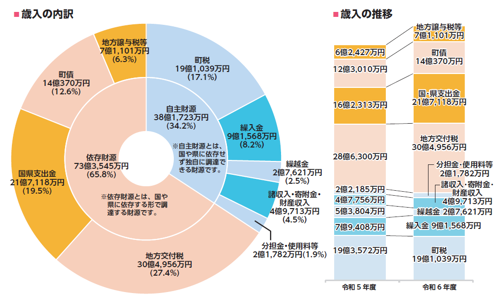町税は前年と比べ2,533万円減額の19億1,039万円、繰越金は2億6,183万円減額の2億7,621万円でしたが、繰入金は1億2,160万円増額の9億1,568万円、諸収入等は1,957万円増額の4億9,713万円となりました。