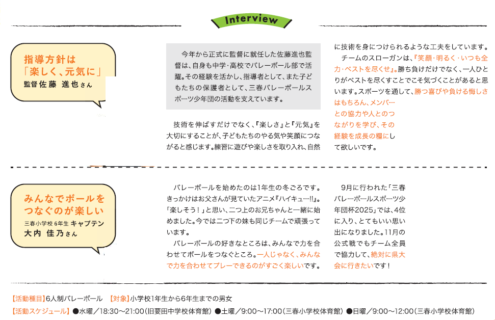 スポーツ がんばる三春町のスポーツ少年団(1) 1/39 次の記事 発行日 : 2025年11月01日 自治体名 : 福島県三春町 広報紙名 : 広報みはる 令和7年11月号 ※詳細は、本紙P.2~3をご覧ください。 Tweet シェアする がんばる三春町のスポーツ少年団(2)