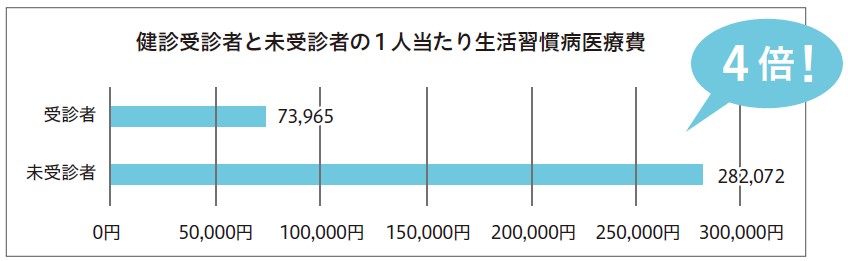 通院中の方も健診の対象となりますので、定期通院のうち1回を健診として受診することが可能です。健診を受けずにいると、医療費が高額となる疾患「脳血管疾患・心疾患・糖尿病性腎症」にかかるリスクが高まります。健診で早期発見し、重症化を予防することで、医療費の抑制につながります。
