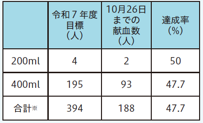 現在までの献血実施状況は下表のとおりです。日頃から健康管理に努め、多くの方が献血会場にお越しになるようあらためてお願いします。