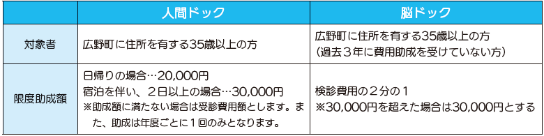 疾病の予防・早期発見、早期治療および健康の保持増進を図ることを目的に、人間ドックおよび脳ドックの受診費用を助成しています。くわしくは保健センターへお問合せください。