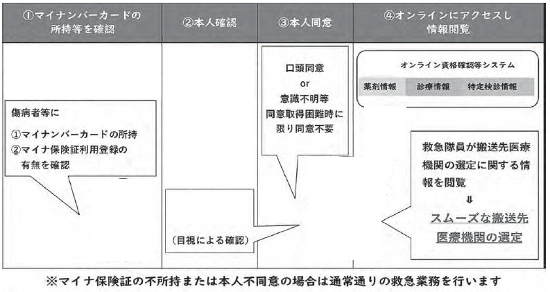 マイナ救急ではマイナンバーカードの健康保険証利用により、救急隊員が出動先でマイナ保険証を読み取り、過去の受診歴や処方された薬などの医療情報を把握することで、迅速な病院選定や病院での早期治療開始に繋げることが期待できることから、令和7年10月から実証事業を開始しました。
