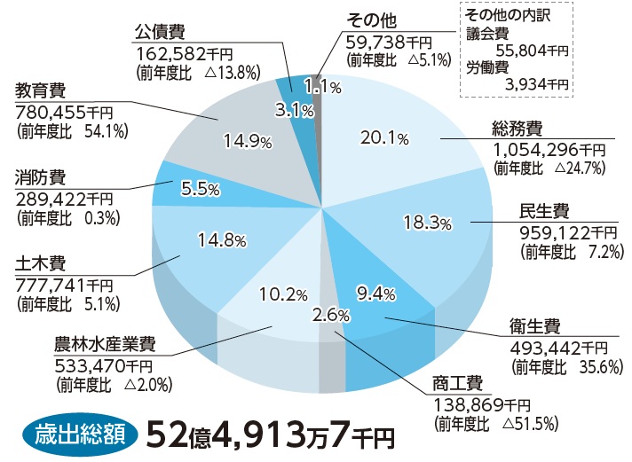 令和6年度の歳出決算額は、前年度52億7,637万5千円に対して、2,723万8千円(0・52%)の減少となりました。
