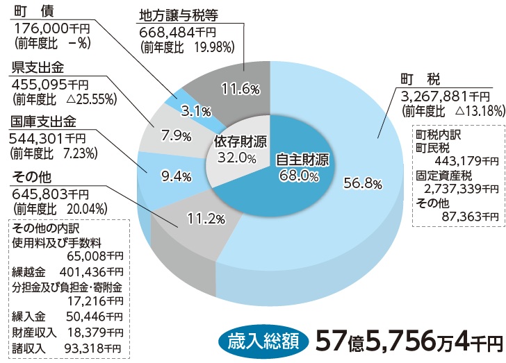 令和6年度の歳入総額は、57億5,756万4千円となりました。歳出総額は、52億4,913万7千円となりました。