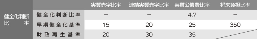 地方公共団体が、財政状況が悪化した状況において、自主的かつ計画的にその財政の健全化を図るべき基準として定められた数値です。健全化判断比率がこの数値を上回った場合は、「財政健全化計画」を策定し、議会の議決を受けた後速やかに町民に公表した上で県知事に報告しなければなりません。