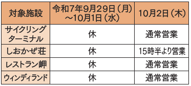 休館期間中はすべての施設(サイクリングターミナル、しおかぜ荘、レストラン岬、ウィンディランド)がご利用いただけません。
