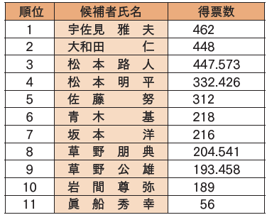開票結果は次のとおりです。なお、議員定数は10名です。